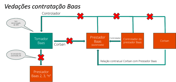 O BCB veda alguns aspectos em relação aos tomadores de serviços Baas, aos prestadores desses serviços e seus controladores, conforme imagem abaixo: